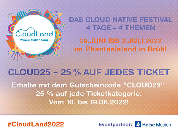 Mit den Themenschwerpunkten "Container- & Cloud-Technologien" am Tag 1, "Microservices & Domain-driven Design" am Tag 2, "DevOps & Methodik" am Tag 3 und "CI/CD & Automatisierung" an Tag 4 schafft die CloudLand 2022 locker den Blick vom Status-quo auf die zukünftigen Herausforderungen im Umgang mit der Cloud-Technologie zu richten. Heise Medien ist Event-Partner des viertägigen Festivals im Phantasialand bei Brühl und auch an der Durchführung vor Ort aktiv eingebunden. Tickets für die CloudLand 2022 gibt es hier, das gesamte Line-up mit über 120 Sessions und einem außergewöhnlichen Rahmenprogramm gibt es hier. Der Hashtag für die CloudLand lautet #cloudland2022. Über das Twitter-Profil der CloudLand-Community verpasst ihr keine News mehr.