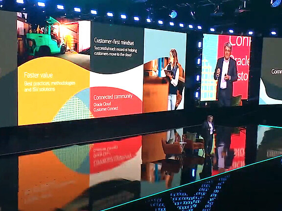 Miranda belegte dies durch drei exemplarische Kundenbeispiele: Providence (Healthcare NFP Organization), CoHu und mit Royal KPN auch ein EMEA-Kunde (Telekommunikationsanbieter aus den Niederlanden). Alle Kunden hatten gemein, dass ein ERP-Projekt eine wichtige Verbindung ist (Kunde <> Dienstleister <> Oracle) – der Vergleich mit einer Hochzeit wurde öfters verwendet – und dass Partnerschaft neben der kompletten Abdeckung der notwendigen funktionalen Bandbreite eine zentrale Komponente ist.