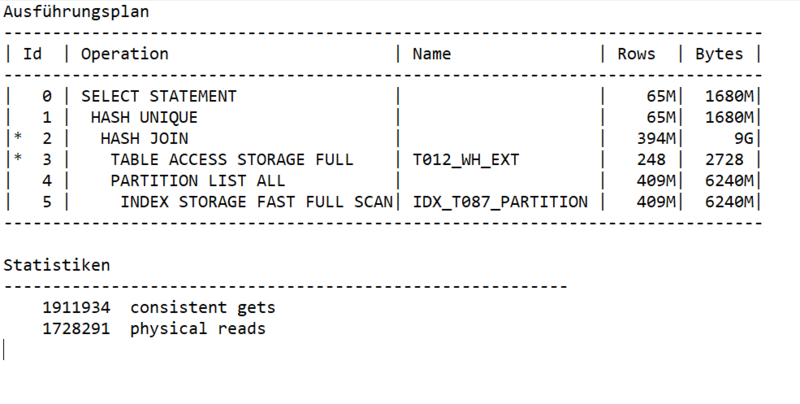 Das Original-SQL-Statement ist relativ einfach. Es soll ein Equi-Join zwischen zwei Tabellen vorgenommen werden. Die eine Tabelle (T087_ITEMSALE_HOURS) hat ca. 410 Millionen Zeilen und ist partitioniert, die andere Tabelle (T012_WH) hat ca. 250 Zeilen. Auf beiden Tabellen sind mehrere Indizes.