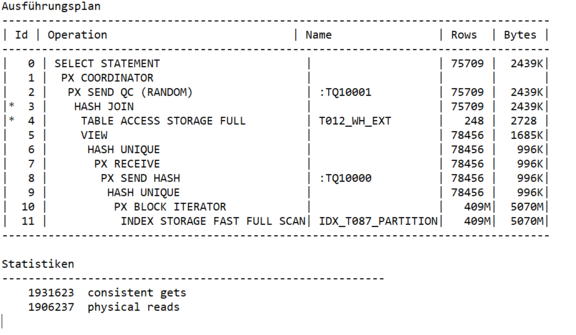 Natürlich konnte ich mit dieser Antwort nicht zufrieden sein. Also habe ich eine Tuningmaßnahme vorgenommen. Ich habe einen /*+parallel */ Hint eingefügt.