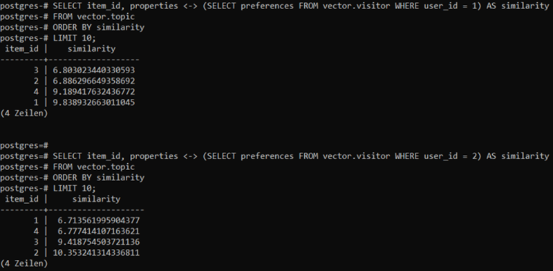 Diese Abfrage vergleicht den Präferenzvektor eines bestimmten Benutzers (user_id = 1) mit den Eigenschaftsvektoren aller Vortragstitel und sortiert die Ergebnisse nach ihrer Ähnlichkeit. Die Top-N-Ergebnisse könnten dann als personalisierte Empfehlungen dem Besucher präsentiert werden. Das Ergebnis von zwei Abfragen ist in Abbildung 3 zu sehen: